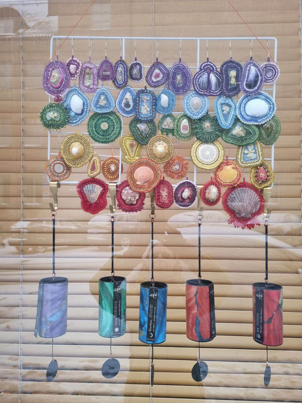 Man kan också hänga upp dem vid en dörr, så låter de lite när du går förbi. Eller någon annanstans inne. Det går att ha dem ute, men då under tak.