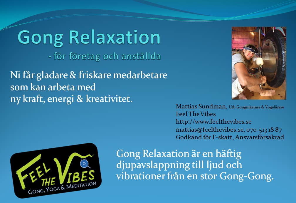 Boka in ett tillfälle för att se hur Gongen kan hjälpa er och era anställda! Ge de anställda en skön återhämtning, så de får ny energi, blir mer kreativa och slipper bli utbrända! Boka in mig och låt deltagarna känna & lära sig mer om hur ljud & vibrationer från klangskålar & Gong kan hjälpa att uppnå djup avslappning & få igång flöden i kroppen. Compassion-Gong - Vetenskap, Meditation & Ljudresa! Soul meets body - Chefsevent för ökad insikt och utsikt! Skicka en Intresse-anmälan!, eller ett mail till foretag@feelthevibes.se så hör jag av mig!